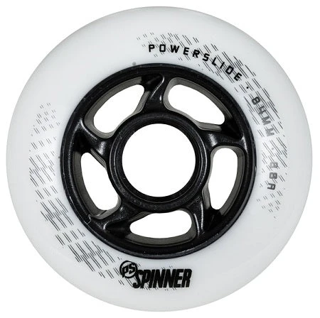 Set of 4 Powerslide Spinner White Wheels in 84mm 85a. Spinner wheels make a great replacement or upgrade set of wheels, coming in fairly hard at 85a they roll fast and are nice and durable.
