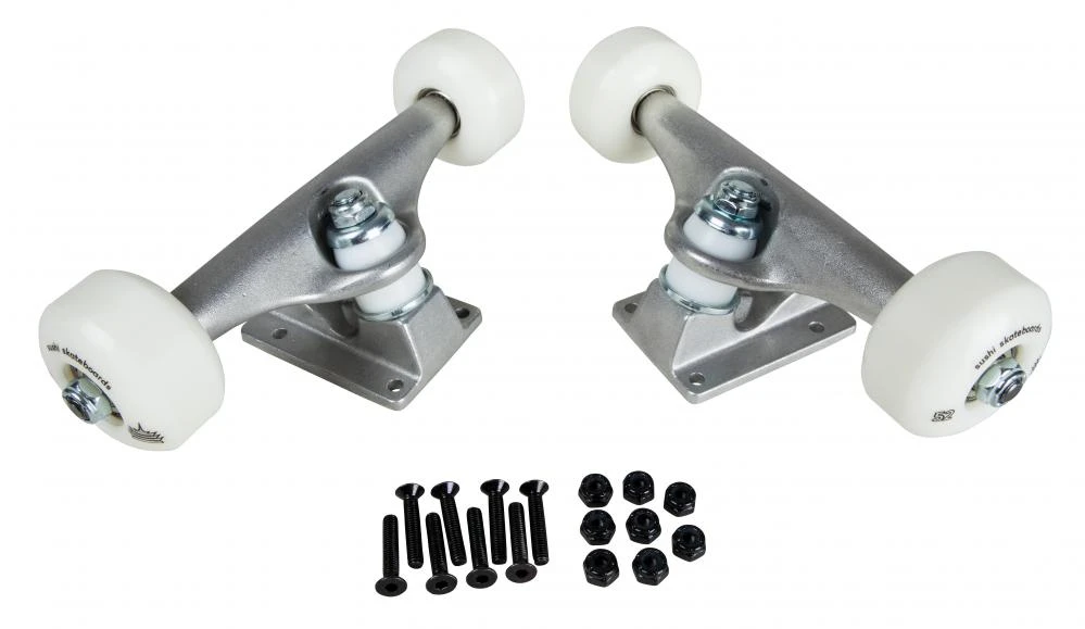 The Sushi Undercarriage Kit is exactly what you need to turn your deck into a complete skateboard, it contains all the hardware required except for grip tape. If you have a deck already or have seen one you like this will get set up and ready to roll.